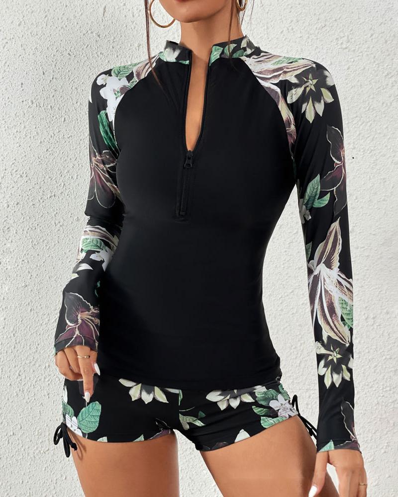 Contrast Floral Print Zipper Design Tankini Set |