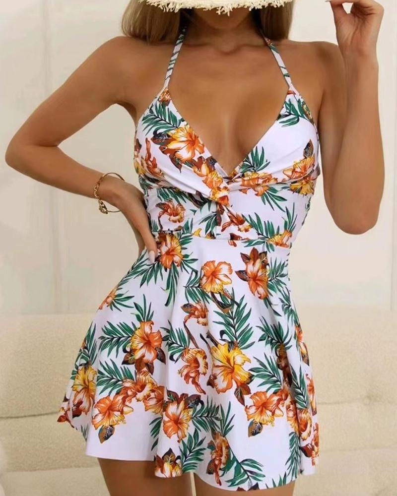 Halter Tropical Print Swim Dress With Panty |