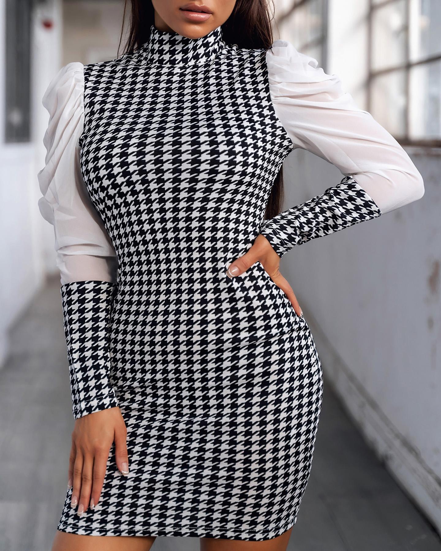 Houndstooth Patchwork Long Sleeve Work Dress |